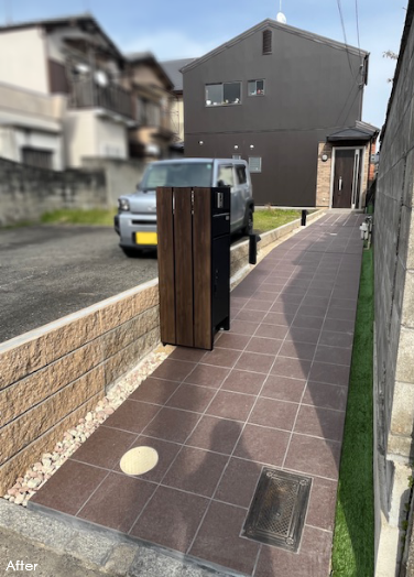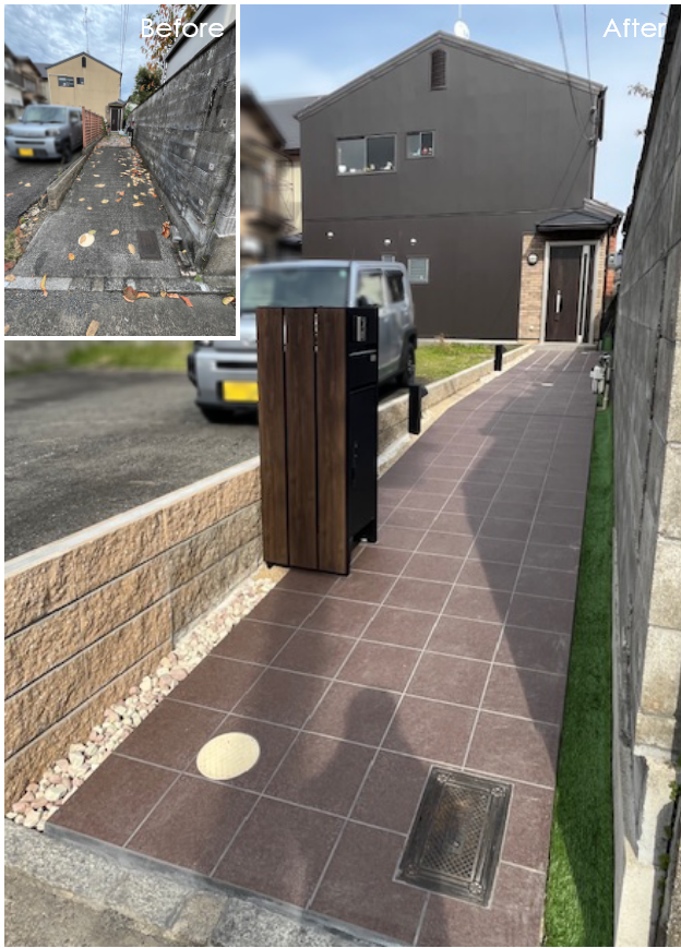 玄関アプローチは、今まで歩きにくくて困っていたのですが、タイルで細部まで丁寧に仕上げていただき、宅配の人が「違う家に来たのかと思いました」と言われたほどです。イメージ通りの仕上がりとなり大変満足しております。岡本さん、職人さんの方々には本当に感謝しています。コープハウジングにお願いして良かったです。またぜひお願いしたいですし、友達にも勧めたいと思います。